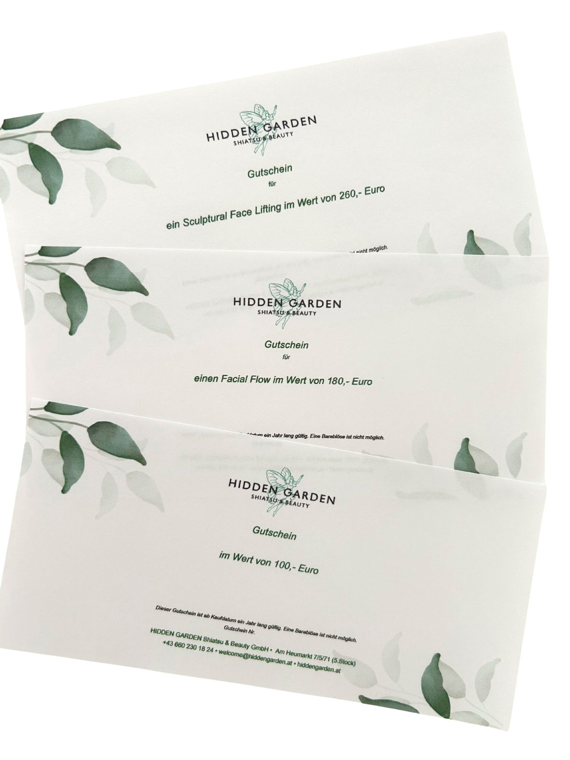 Wird der Gutschein für einen bestimmten Geldwert gekauft, ist dieser für alle im HIDDEN GARDEN angebotenen Leistungen einlösbar*.